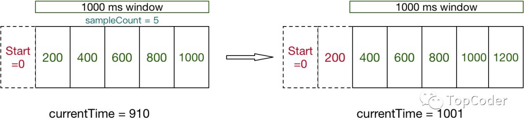 滑动时间窗口算法就是根据当前时间获取对应的时间窗口,时间窗口保存有流量相关的统计值,根据该统计值判断是否触发流控。