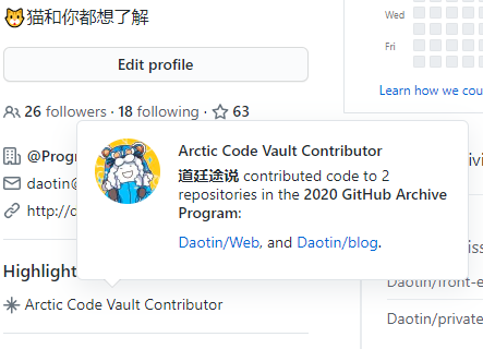 为了表彰这些程序员们,GitHub还设计了荣誉徽章。只要鼠标在开发者主页资料介绍部分悬停,就能看到有哪些项目被放到了北极。