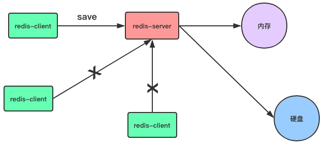 当客户端向服务器发送 Save 命令请求进行持久化时,服务器会阻塞 Save 命令之后的其他客户端的请求,直到数据同步完成。