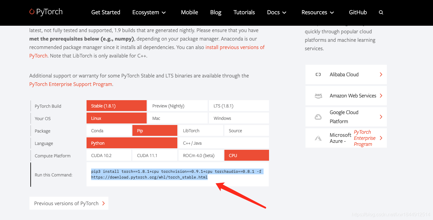 1).进入官网https://pytorch.org/,找到适合自己的pytorch版本,我的选择版本(如第一张图),复制"Run this Command"的两条命令。