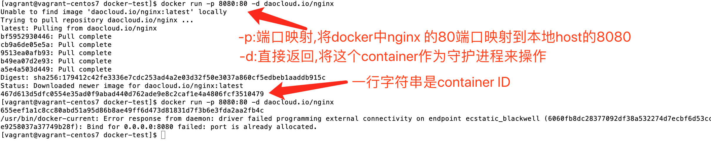 docker run -p 8080:80 -d daocloud.io/nginx: 返回字符串是容器ID, -p:端口映射,将容器的nginx 80端口映射到本地的8080端口,-d :直接返回,将这container左右守护进程执行
