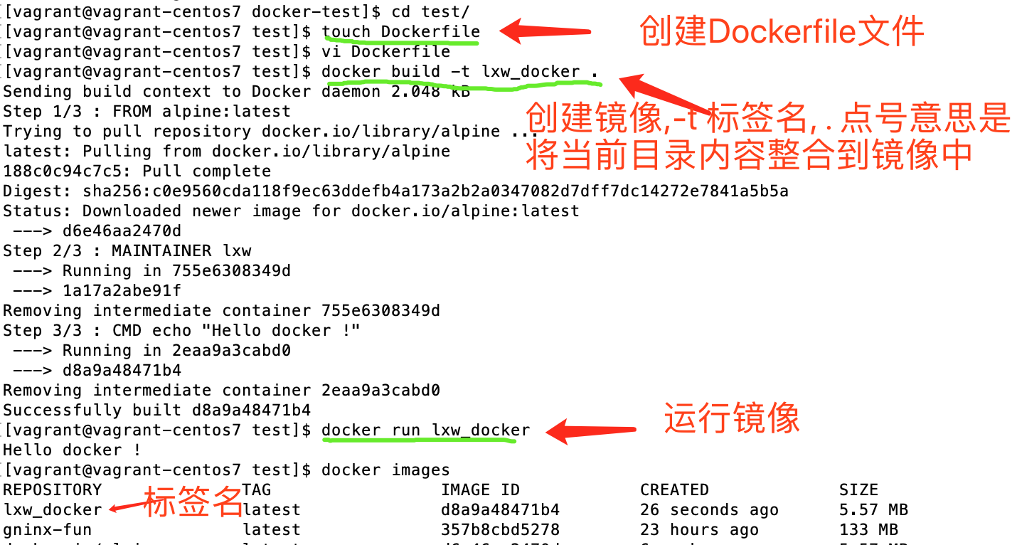 docker build -t lxw_docker . : 创建镜像,-t 标签为 lxw_docker , . (点号)