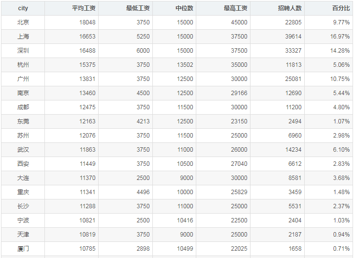 北京,上海,深圳,杭州,广州四地的工资最高。
