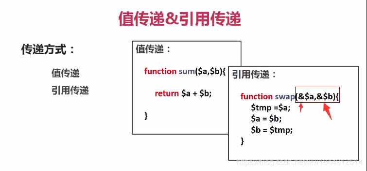 function swap($a,$b){ $tmp=$a; $a=$b; $b=$tmp; } $a1=3; $b1=5; swap($a1,$b1); echo "a:".$a1."b:".$b1; //结果 a1=3,b1=5 引用传递:形参没有开辟空间,直接在$a1,$b1空间上进行交换 function swap(&$a,&$b){ $tmp=$a; $a=$b; $b=$tmp; } $a1=3; $b1=5; swap($a1,$b1); echo "a:".$a1."b:".$b1; // 值发生交换,a1=5,b1=3