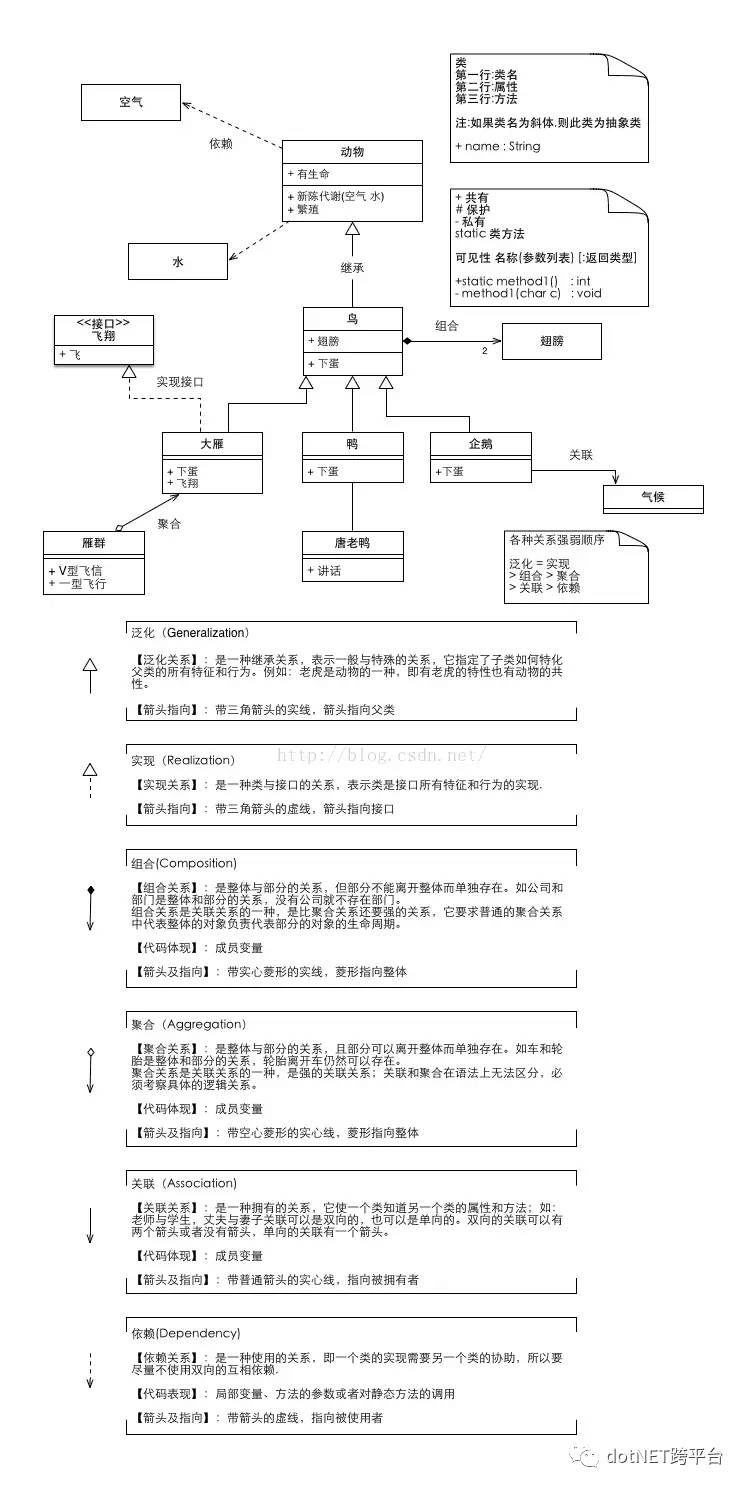 虚线箭头指向依赖; 实线箭头指向关联; 虚线三角指向接口; 实线三角指向父类; 空心菱形能分离而独立存在,是聚合; 实心菱形精密关联不可分,是组合;