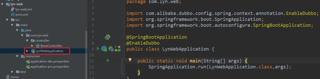 再写四个提供者的启动类(其他模块的一样,都在***-service下),注意一定要有@EnableDubbo注解,用来开启Dubbo服务。