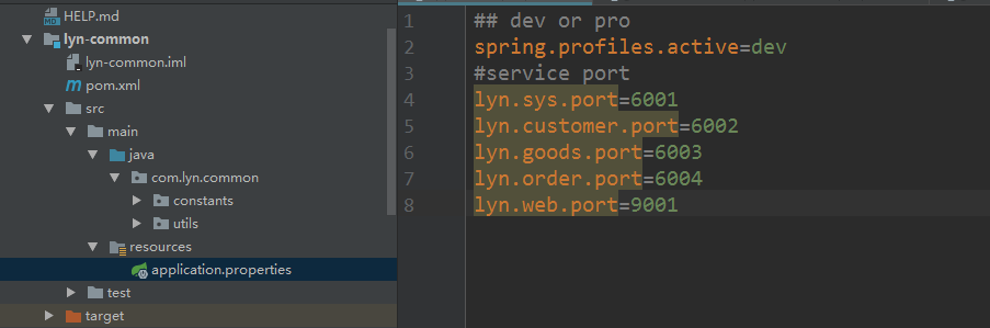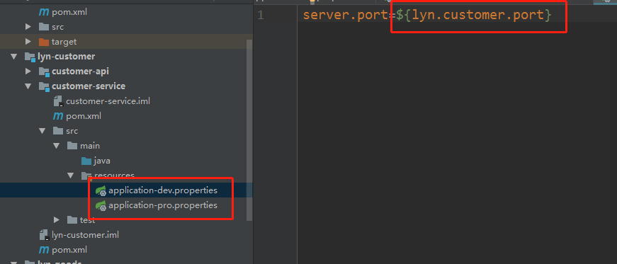 统一配置需要在对应模块的resources下创建application-dev.properties和application-pro.properties,并在这两个配置里添加service.port=${lyn.***.port},然后让此模块依赖lyn-common即可。当服务启动时,首先会找到lyn-common下的application.properties文件,并读取里面的属性,再根据读到的spring.profiles.active值去匹配加载对应本模块下的application-***.properties。并将读到的lyn.***.port值赋值给本模块service.port属性。具体模块下的配置以lyn-customer为例。