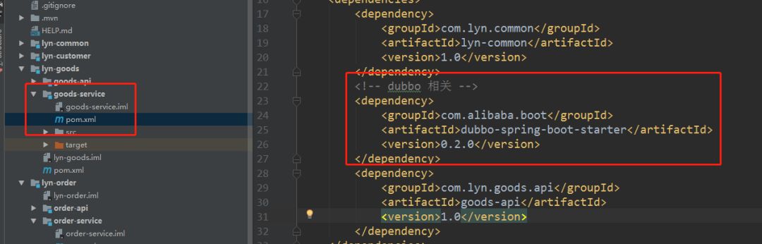 在消费服务lyn-web下的pom里添加Dubbo依赖及提供者的Service接口依赖。