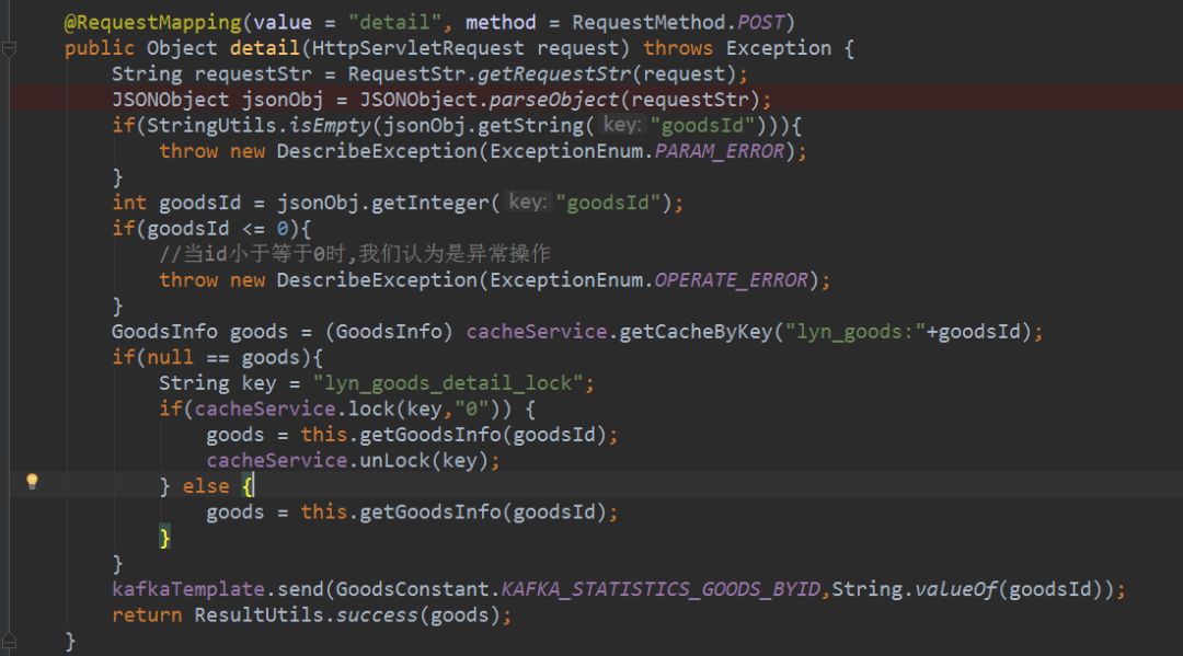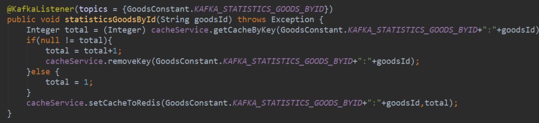 大家不难看到,我使用Kafka对搜索的商品次数做了统计(仅仅是测试代码)。先在接口层,每请求一个商品查询接口,就把查询的商品ID发送到Kafka消息队列,再在服务层监听统计查询次数。