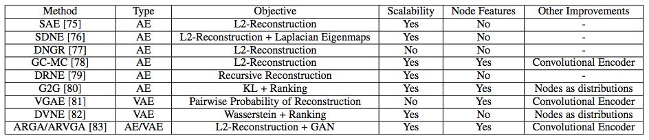 自编码器(AE)及其变体在无监督学习中得到广泛使用,它适合在没有监督信息的情况下学习图的节点表征。这部分首先介绍图自编码器,然后介绍图变分自编码器和其他改进版变体。
