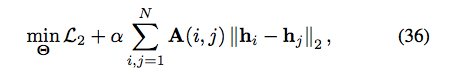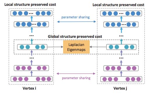 结构深度网络嵌入(Structure Deep Network Embedding,SDNE)[76] 解决了这个难题,它表明 Eq. (35) 中的 L2 重建损失对应二阶估计,即如果两个节点具备类似的近邻,则它们共享类似的隐藏表征。受表明一阶估计重要性的网络嵌入方法的启发,SDNE 修改了目标函数,添加了一个类似于拉普拉斯特征映射的项: