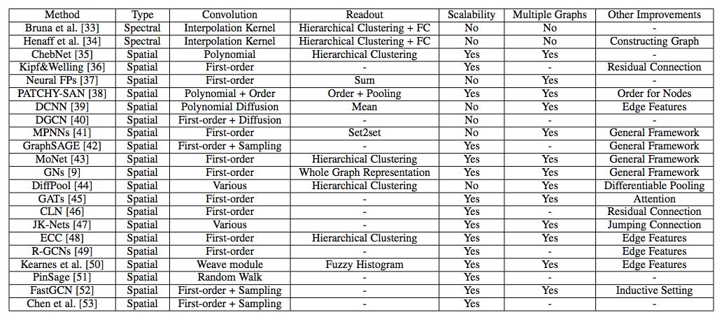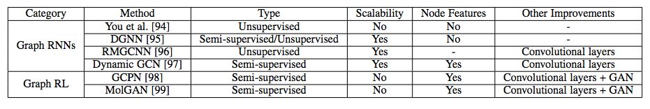 复合性。如前所述,很多现有架构可以结合起来使用,例如将 GCN 作为 GAE 或 Graph RNN 中的一个层。除了涉及新的构造块以外,如何符合这些已有架构是一个有趣的未来研究方向。近期研究 Graph Networks [9] 跨出了第一步,它使用 GNN 和 GCN 的通用框架来解决关系推理问题。