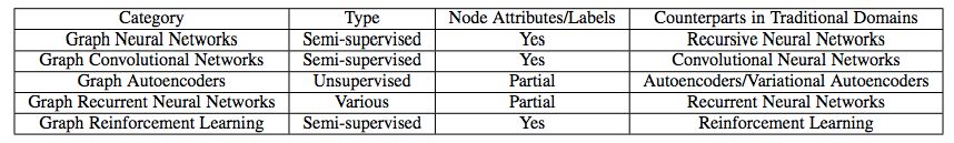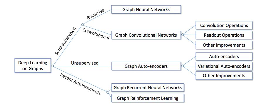 他们将现有方法分为三个大类:半监督方法,包括图神经网络和图卷积网络;无监督方法,包括图自编码器;近期新的研究方法,包括图循环神经网络和图强化学习。然后按照这些方法的发展史对它们进行系统概述。该研究还分析了这些方法的区别,以及如何合成不同的架构。最后,该研究简单列举了这些方法的应用范围,并讨论了潜在方向。