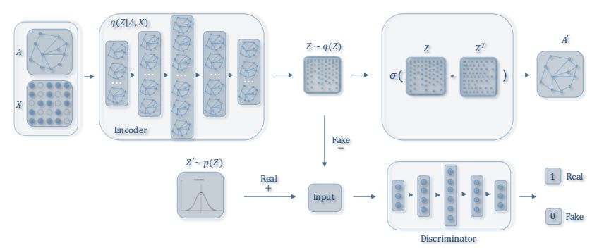 图 9:ARGA/ARVGA 框架图。该方法向 GAE 添加了对抗训练机制。(图中的符号与本文主题略有不同,图中的 X 和 Z 分别对应 F^V and H。