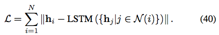 DRNE [79] 没有重建邻接矩阵或其变体,而是提出另一种修改:使用 LSTM 聚合近邻信息,从而直接重建节点的低维向量。具体来说,DRNE 最小化以下目标函数: