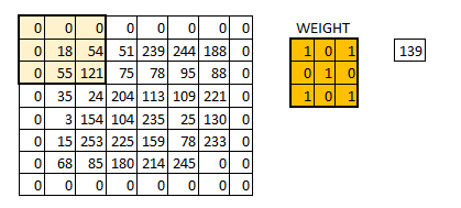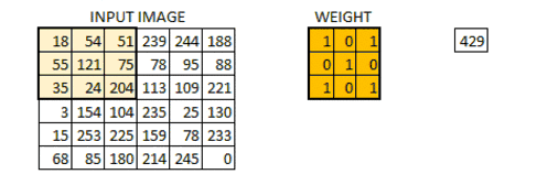 我们把权值初始化成一个 3*3 的矩阵。这个权值现在应该与图像结合,所有的像素都被覆盖至少一次,从而来产生一个卷积化的输出。上述的 429,是通过计算权值矩阵和输入图像的 3*3 高亮部分以元素方式进行的乘积的值而得到的。