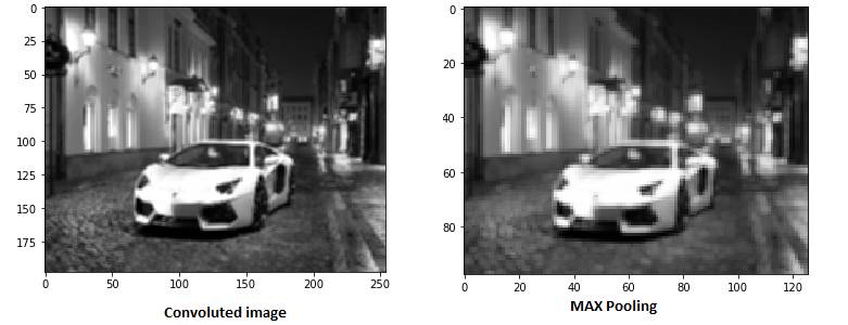 正如你看到的,我们卷积了图像,并最大池化了它。最大池化图像仍然保留了汽车在街上的信息。如果你仔细观察的话,你会发现图像的尺寸已经减半。这可以很大程度上减少参数。