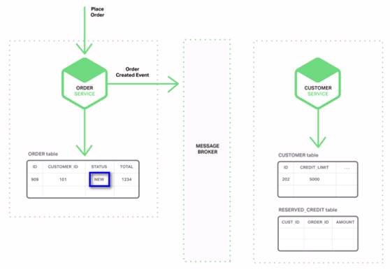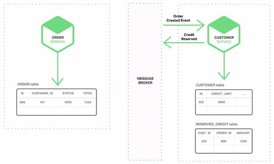 下图展现如何使用事件驱动方法,在创建订单时检查信用可用度,微服务之间通过消息代理(Messsage Broker)来交换事件。