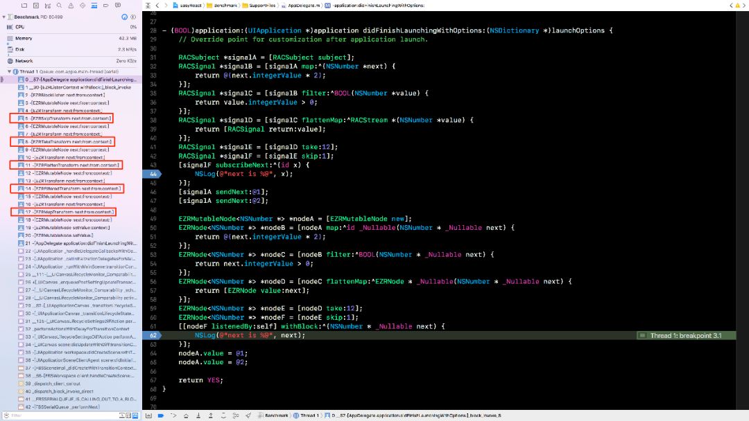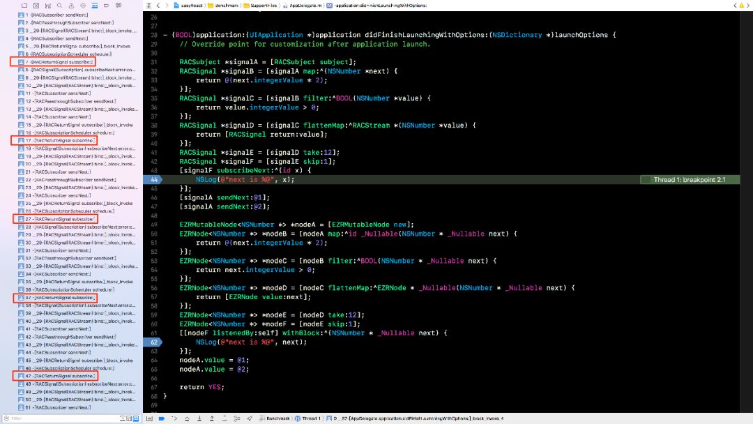 EasyReact 利用对象的持有关系和方法调用来实现响应式中的数据流动,所以可方便的在调用栈信息中找出数据的传递关系。在 EasyReact 中,进行与前面 ReactiveCocoa 同样的 5 次简单变换,其调用栈只有 15 层(见下图)。