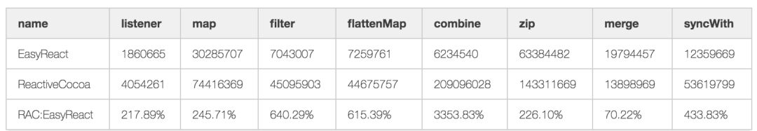 ReactiveCocoa 平均耗时是 EasyReact 的 725.41%。