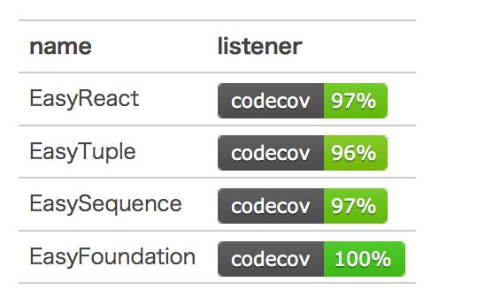 EasyReact 系列立项之时,就以高质量、高标准的开发原则来要求开发组成员执行。开源之后所有项目使用 codecov.io 服务生成对应的测试覆盖率报告,Easy 系列的框架覆盖率均保证在 95% 以上。