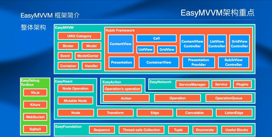 目前开源的框架组件只是建立起响应式编程的基石,Easy 系列的初心是为 MVVM 架构提供一个强有力的框架工具。下图是 Easy 系列框架的架构简图: