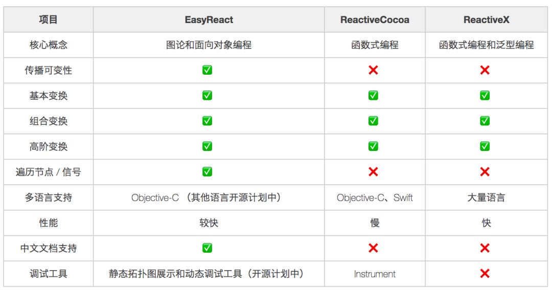 EasyReact 从诞生之初,就不可避免要和已有的其他响应式编程框架做对比。下表对几大响应式框架进行了一个大概的对比: