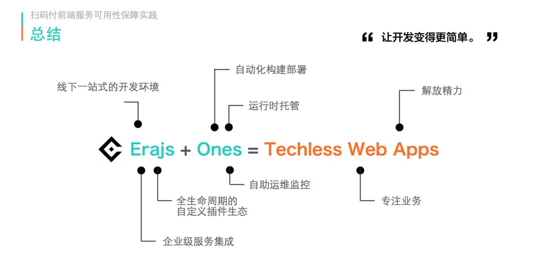 我们发现很多前端同学都把时间花在业务开发和功能覆盖上,对于自己的系统缺少完整性的认知。所以建议大家可以先做一个通用的解决方案,覆盖从前端到后台,从研发、测试、上线的全流程。