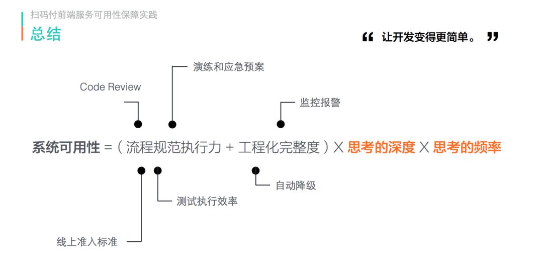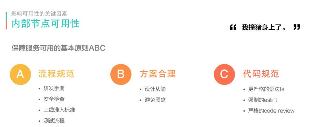 流程规范:很多的前端事故的主要原因就是流程不规范,所以建议整个研发流程要用SOP来规避一些问题。比如上线的准入标准,服务必须达到一定的标准才能上线,在没有明确之前不准上线等等。