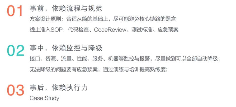 事后依赖执行力,要做可落地的Case Study。很多同学都是在事后复盘的时,说这次没有做好,代码写错了,没有太注意,这是别人的问题等等,草草就结束了。但是对下次事故来说,并没有预防的动作和可落地的执行方案。这就要求执行力,也看解决问题的决心。