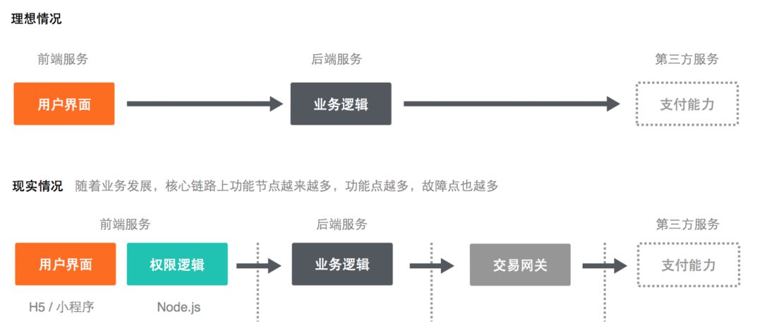 比如金融最大的问题要合规,这就导致很多业务设计上,必须强制做很多功能节点,随着业务发展过程中节点越来越多,这必然导致服务的可用性越来越差,可能实际情况比下面这张图更复杂: