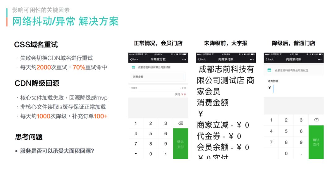 而JS文件涉及一些依赖的文件,所以我们采用一个比较稳妥的方案:在判断核心的JS文件加载失败时,降级为一个MVP的版本,来保障交易的正常进行。如下图所示,在没有做静态资源降级之前,这个门店是正常的会员门店,会有促销的活动和信息。在CDN出现问题时,它会出现白屏问题。而在经过降级处理之后,我们可以把整个页面回退成普通的门店,就不包含营销或者促销信息了。