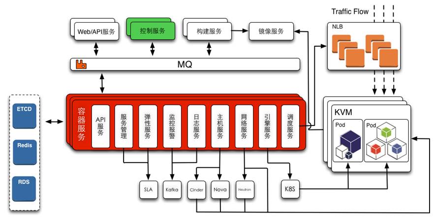 网易开发了自己的一个容器服务平台,将OpenStack的IaaS层和Kubernetes容器层深度融合起来,从而实现一个完整的公有云体系。从图中可以看出,容器服务平台会调度OpenStack的计算服务Nova来创建KVM虚拟机,然后调用Cinder进行云盘的创建于挂载,调用Neturon进行网络的创建与连接,然后调用Kubernetes进行容器创建,还可以调用NLB挂载负载均衡器。