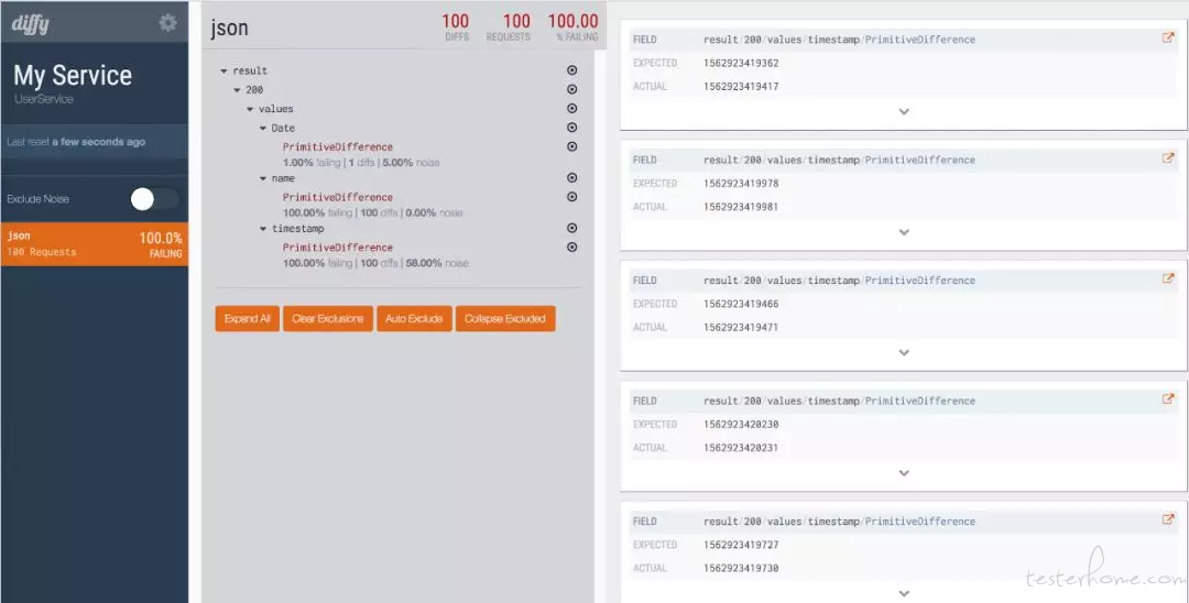 如图所示,我们可以看到每个请求在不同节点上的差异之处,如果点击“Exclude Noise”,则可以消除噪声,看到最终的diff结果。