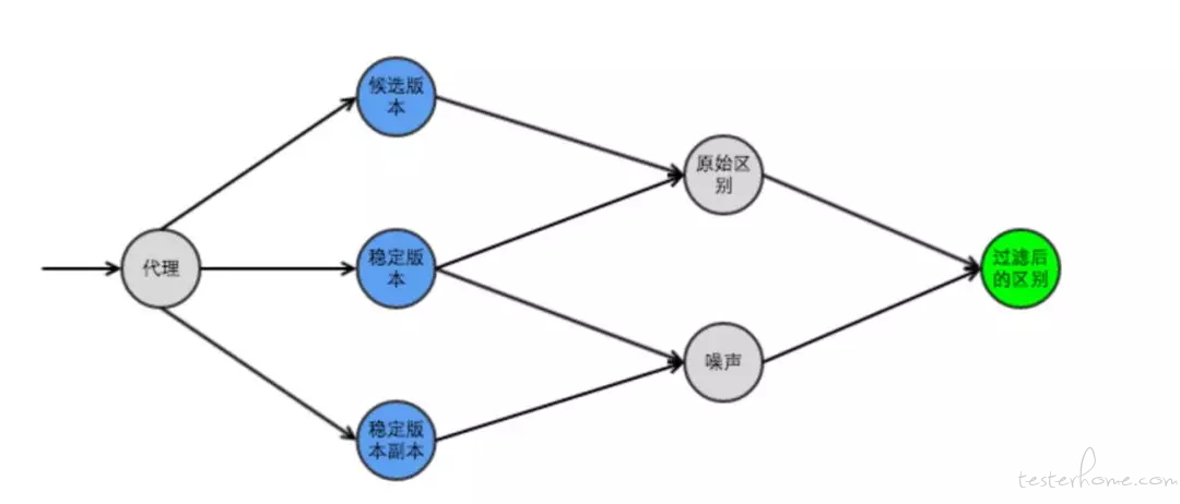在测试过程中,Diffy充当一个代理,它能够将来源请求分发到不同版本的系统中去,通过对各个版本系统的输出进行对比,做出最终的结论。