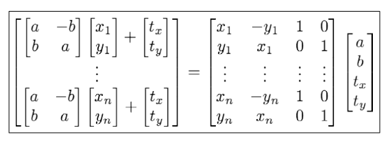 通过Procrustes analysis对齐的特征向量,我们要用一个统一的矩阵把平移和旋转统一起来表示(成为线性表示),然后把该矩阵追加到局部变形空间,注意对该矩阵表示,我们最后进行了史密斯正交处理。这儿x1,y1,....xn,yn是Y矩阵的平均列向量,也就是标准形状(权威形状)。