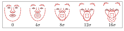最后我们要注意的一点是如何约束子空间坐标,以使得子空间内的面部形状都是有效的。在下面的图中,我们可以看到,对于子空间内的图像,如果在某个方向改变坐标值,当坐标值小的时候,它仍是一个脸的形状,但是变化值大时候,就不知道是什么玩意了。防止出现这种情况的最简单方法,就是把变化的值clamp在一个范围内,通常是现在± 3 的范围,这样可以cover到99.7%的脸部变化。clamping的值通过下面的代码计算: