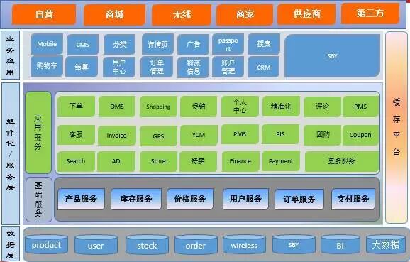 下图是一个大型B2C电商系统实际的架构,上层是各种业务应用,底层是大量服务,并且服务分为应用服务(面向业务)和基础服务(面向共享主题),一个非常典型的微服务架构。