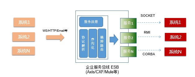 每个遗留系统提供服务,该服务作为系统的前置代理,对外提供访问。所有这些服务部署在一个中心化的平台,称之为企业服务总线ESB(Enterprise Service Bus),ESB提供复杂处理,包括: