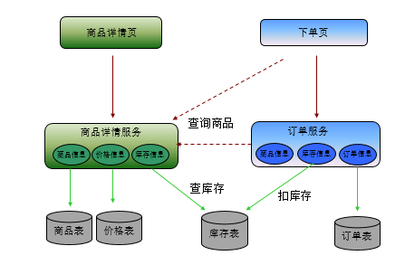 举一个电商的例子,这里有两个应用,顾客使用的商品详情页,展示商品的信息、商品库存,商品价格;下单页供顾客下单,涉及商品查询、库存扣减、生成订单等。