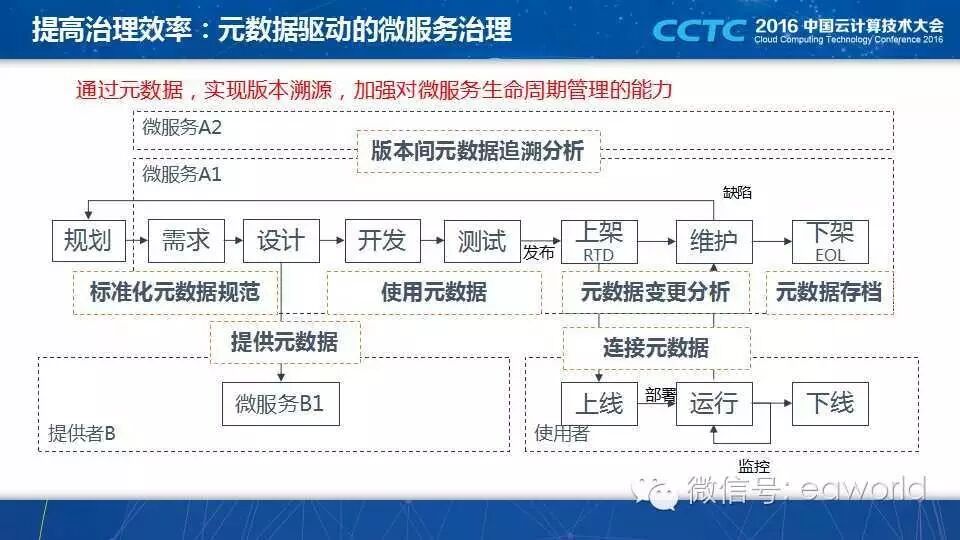 面向互联网应用的微服务架构,是一个分布式架构,比较复杂,因此必须提高治理的效率,我们是用元数据来完成的,这是一个元数据在微服务架构中应用的例子。