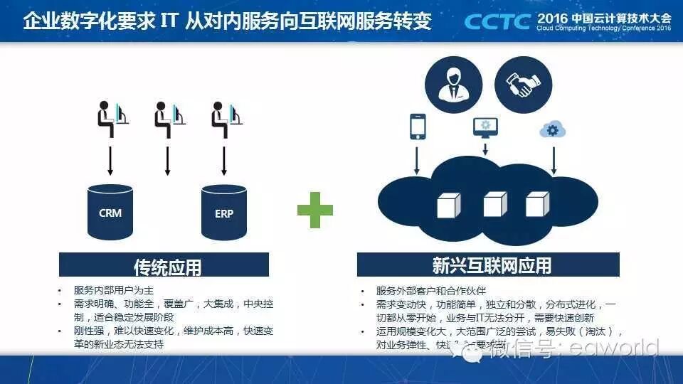 数字化对 IT 的要求,来自从对内服务为主,增加了对外服务的模式,以云计算的模式,直接面向最终客户和合作伙伴,由于服务对象、业务范围发生了很大变化,需要采用不同的架构实现。