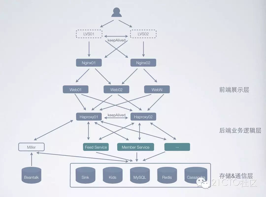 按照调用关系,知乎的服务分成了3层:聚合层、内容层和基础层。按属性又可以分成3类:数据服务、逻辑服务和通道服务。数据服务主要是一些要做特殊数据类型的存储,比如图片服务。逻辑服务更多的是CPU密集、计算密集的操作,比如答案格式的定义、解析等。通道服务的特点是没有存储,更多是做一个转发,比如说Sink。