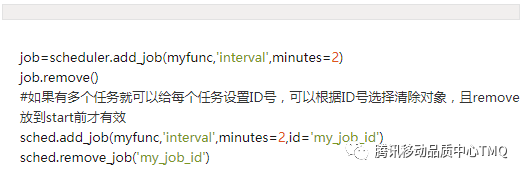 1 job = scheduler.add_job(myfunc, 'interval', minutes=2) 2 job.remove() 3 #如果有多个任务序列的话可以给每个任务设置ID号,可以根据ID号选择清除对象,且remove放到start前才有效 4 sched.add_job(myfunc, 'interval', minutes=2, id='my_job_id') 5 sched.remove_job('my_job_id')