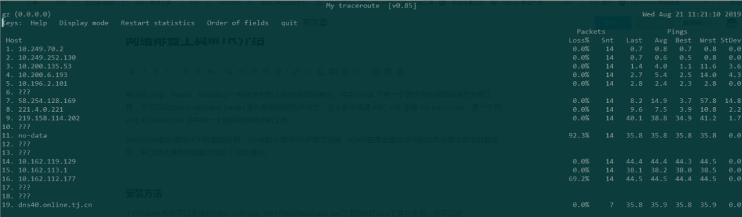常用的 ping,tracert,nslookup 一般用来判断主机的网络连通性,其实 Linux 下有一个更好用的网络联通性判断工具,它可以结合ping nslookup tracert 来判断网络的相关特性,这个命令就是 mtr。mtr 全称 my traceroute,是一个把 ping 和 traceroute 合并到一个程序的网络诊断工具。