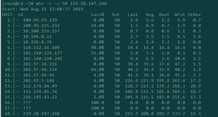 最后一列 StDev 提供了数据包在每个主机的标准偏差。如果标准偏差越高,说明数据包在这个节点的延时越不相同。标准偏差会让您了解到平均延时是否是真的延时时间的中心点,或者测量数据受到某些问题的干扰。