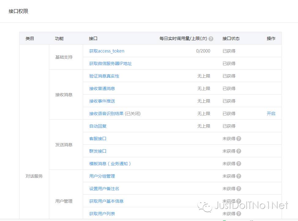登录微信公众号平台(https://mp.weixin.qq.com)在左侧导航栏中,找到”开发”中”基本配置”(图1)中可看到AppID和AppSecret,以及服务器配置相关项(图2)。在”接口权限”关于接口权限列表的获取(图3)