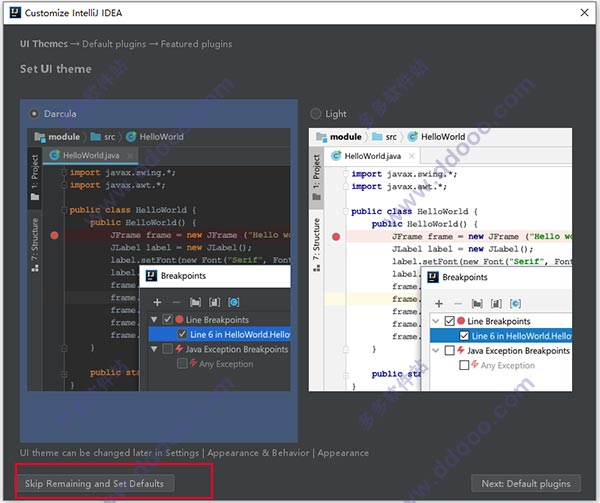 我们可以自行选择,因为如果使用它默认的有很多没用的插件,我们都用不着,会让你的idea特别卡,所以我们最好是按照自己的需求定制功能插件,首先我们点击java Frameworks下面的Customize来配置Java相关的