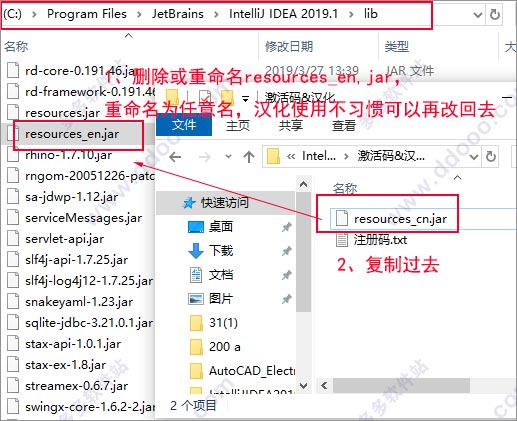 打开安装目录下的“lib”文件夹,将原来的resources_en.jar英文版文件删除或重命名,再将汉化补丁“resources_cn.jar”复制入内即可,默认安装路径【C:Program FilesJetBrainsIntelliJ IDEA 2019.1lib】resources_en.jar重命名是为了返回英文界面,因为有用户说汉化不是很全面,但99%汉化好了。