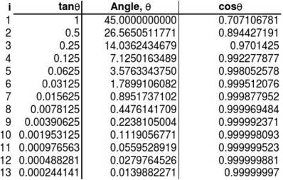 注意!查找表中所有θi的总和约为99度,因此能实现计算的角度在-99~99度之间。实际算法实现时,我们可预先判断坐标象限,人为将其转化为第一象限内的计算,并在事后补偿为真实值。